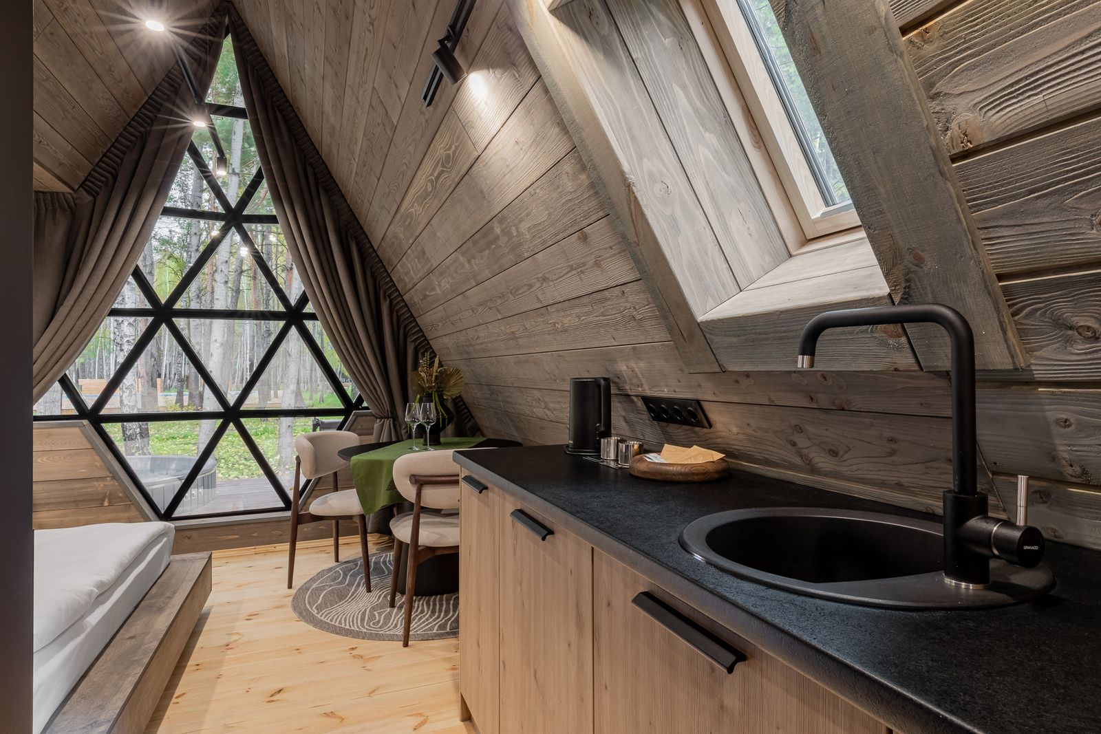 У кожному котеджі знаходиться холодильник, де можна залишити продукти. В будиночках також є власна міні-кухня з усім необхідним для приготування ароматних страв. У вартість проживання входять сніданки, які доставляють прямо у будиночок.